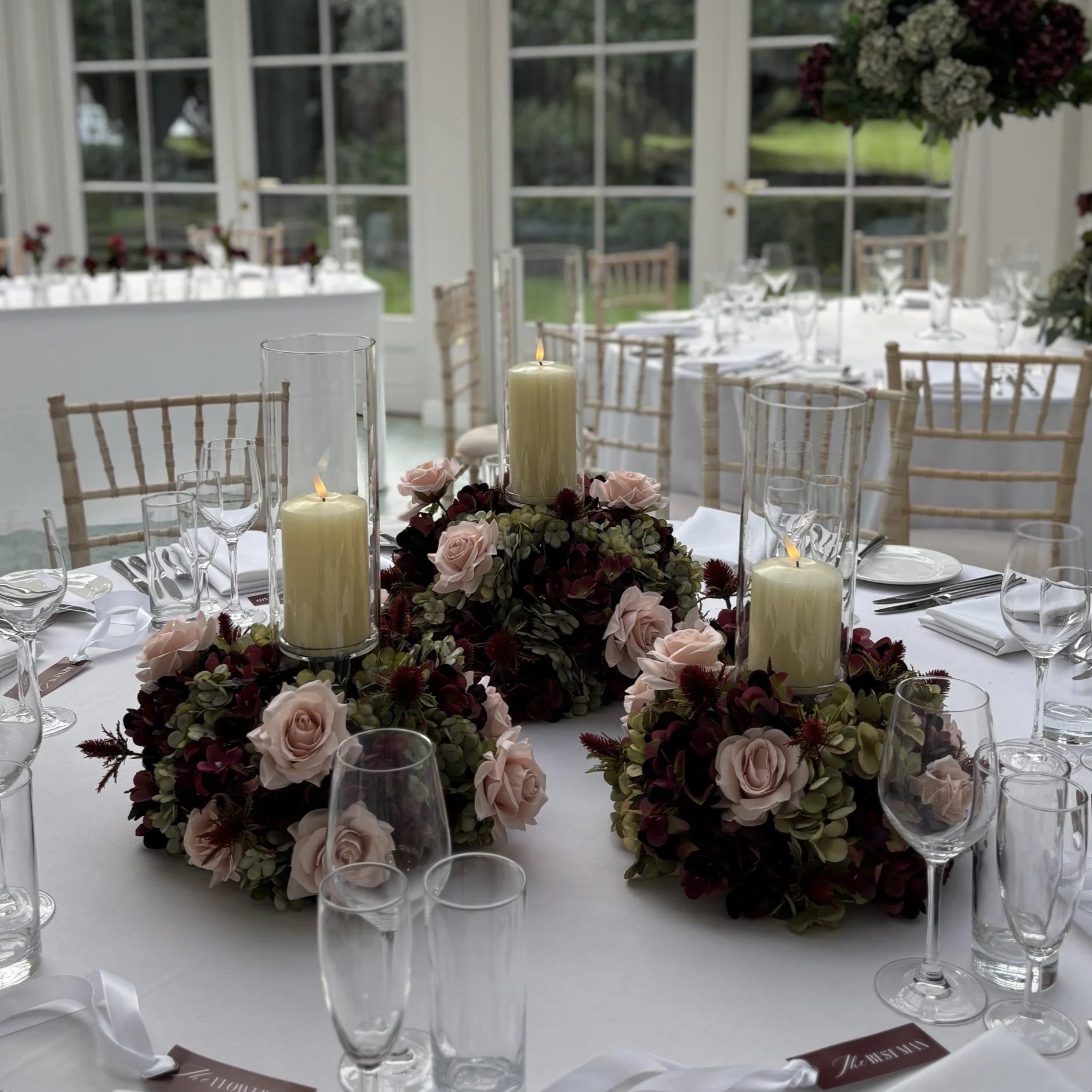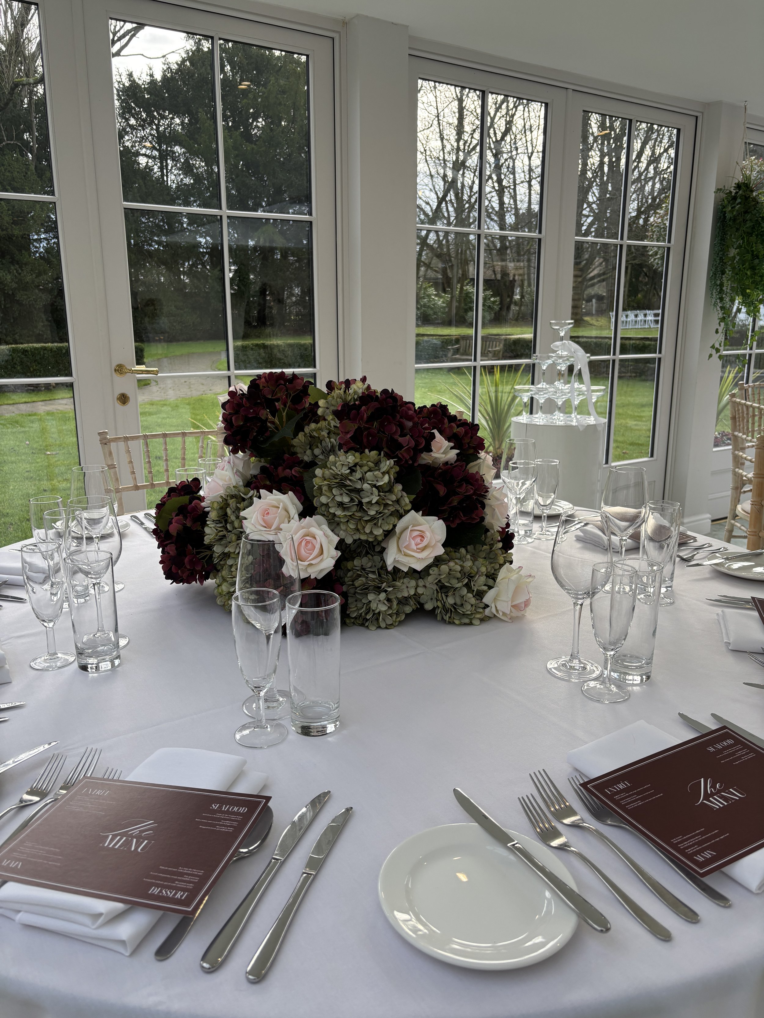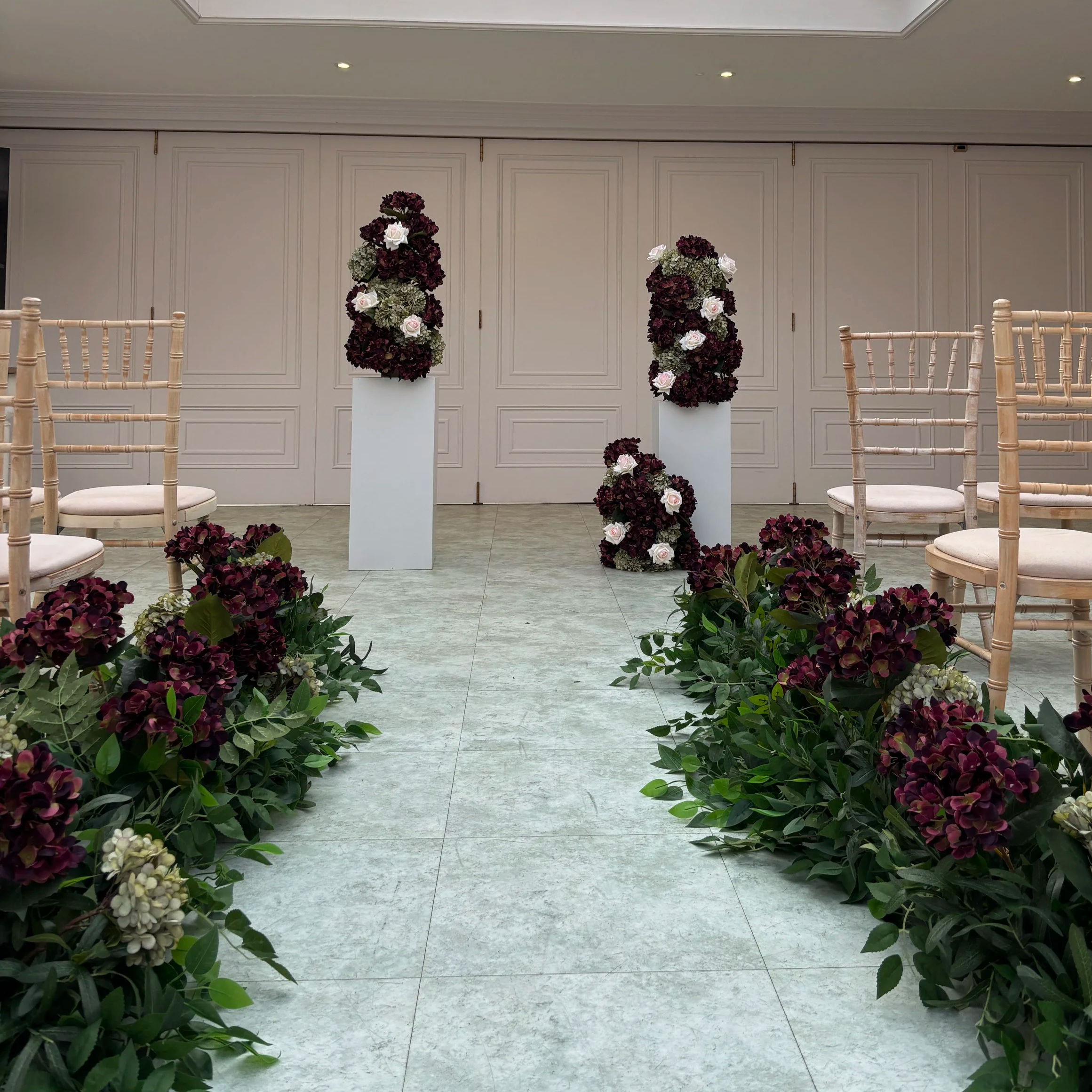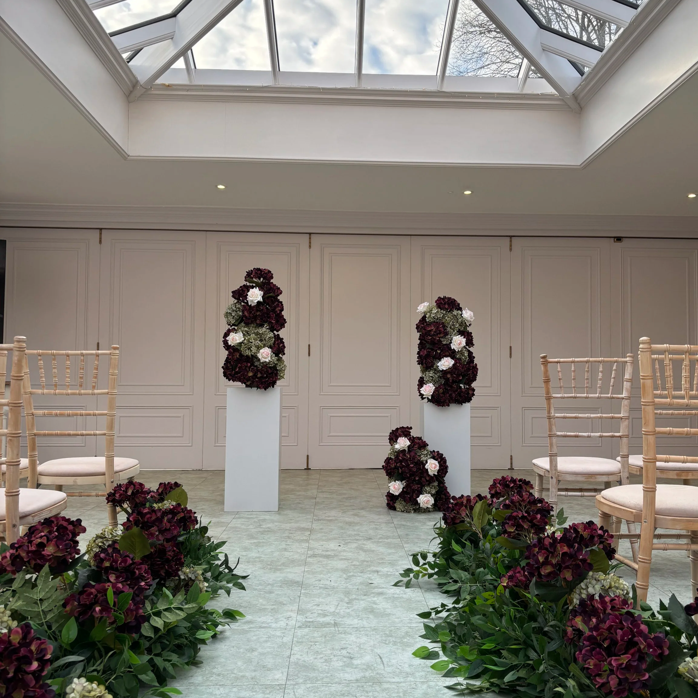 Ceremony florals can easily be repurposed to the reception area i.e ceremony floral arch to then frame the reception top table/ aisle blooms to be repurposed with or without stands as center pieces.